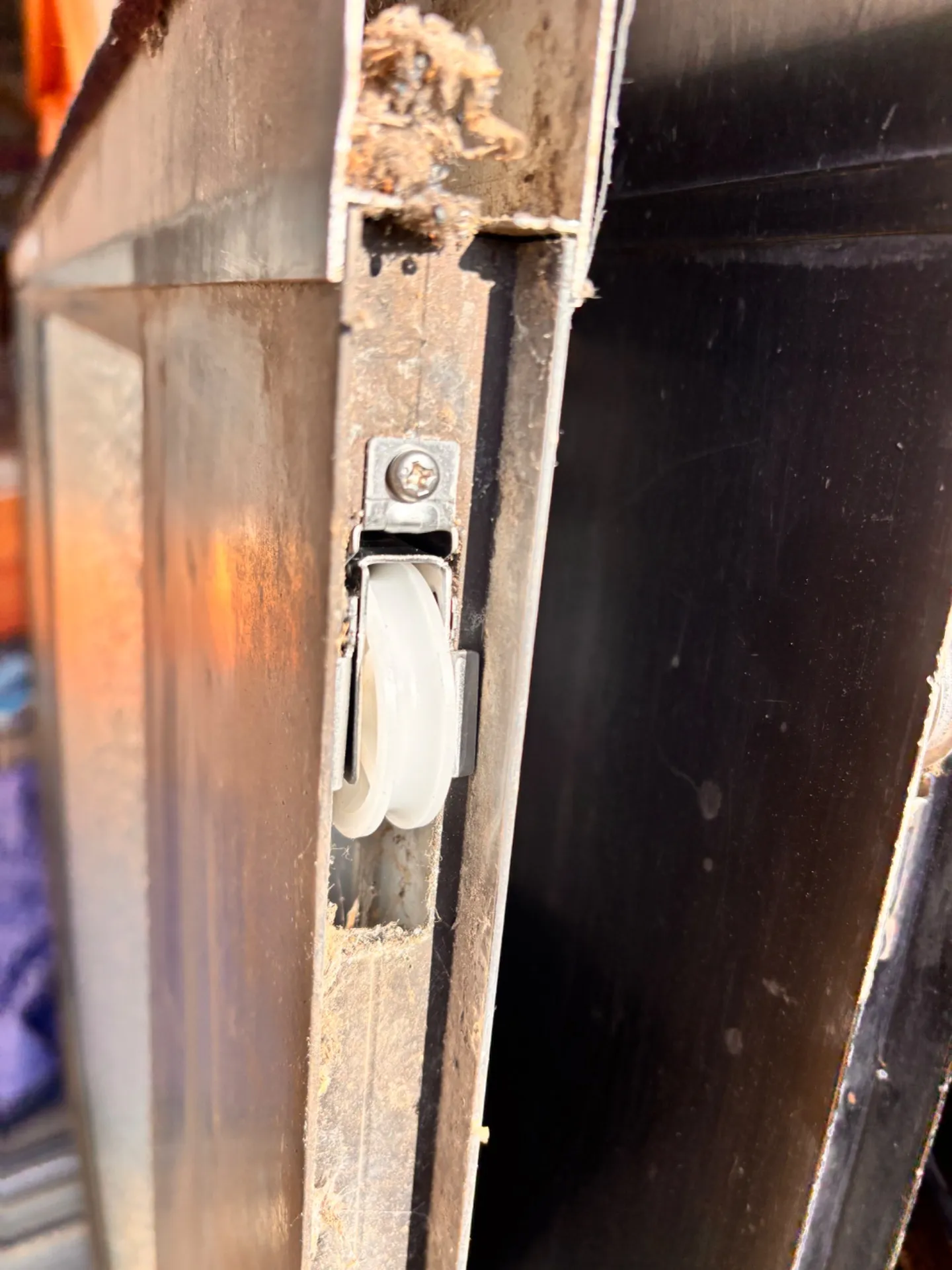 原因を調べてみると、ドアの足元で回転している**「戸車(とぐるま)」**という小さな部品が、長年の使用で摩耗し、すり減ってしまっていました。